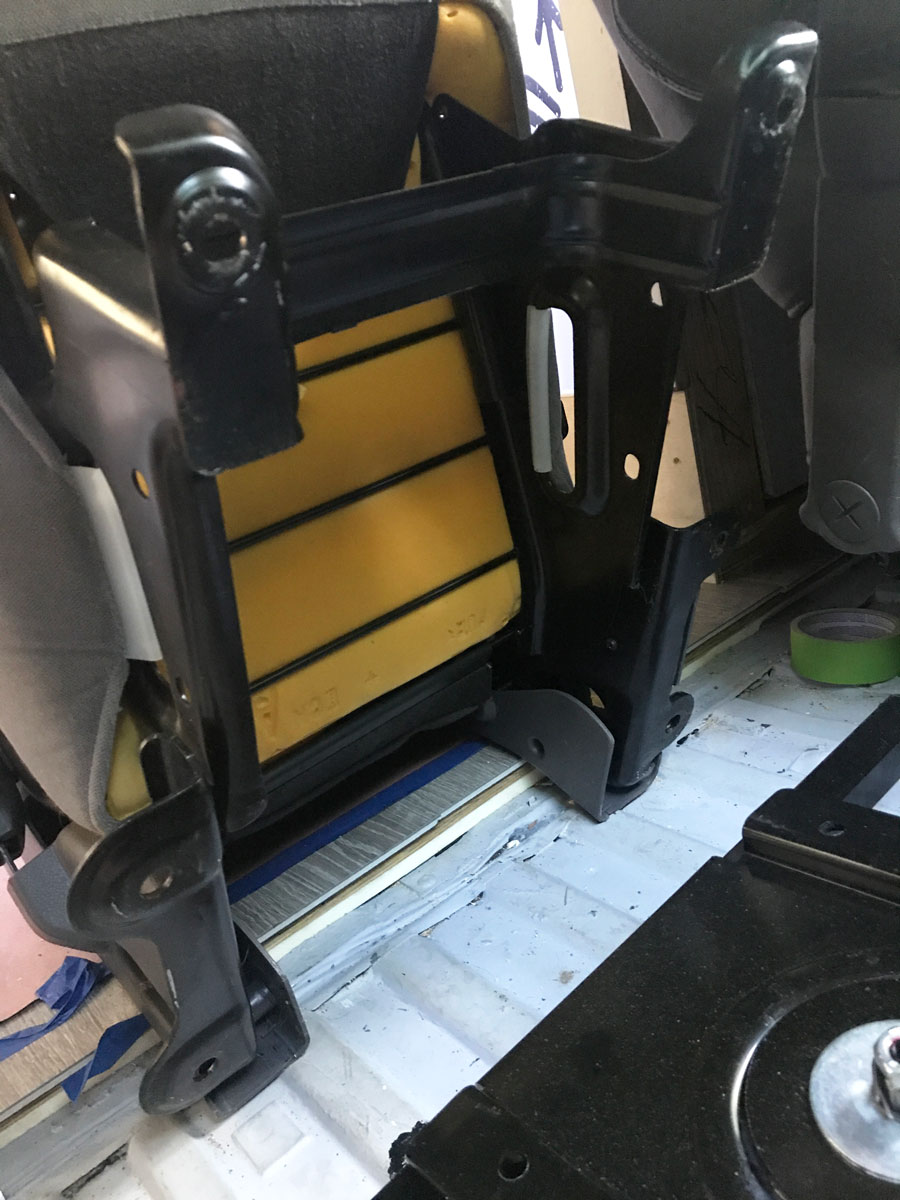 Most car seats are built onto a frame that bolts down into the car’s floorpan, which is reinforced with thicker steel, or plates, with a captive nut for the bolt to go through. A captive nut is not like Jack Nicholson in One Flew Over the Cuckoo’s Nest, rather, it’s an actual nut, or threaded chunk of steel built into a thing so you just have to worry about reaching the bolt, and not the nut. Since the bus did not come with a seat in that exact location, we had to have a workaround.