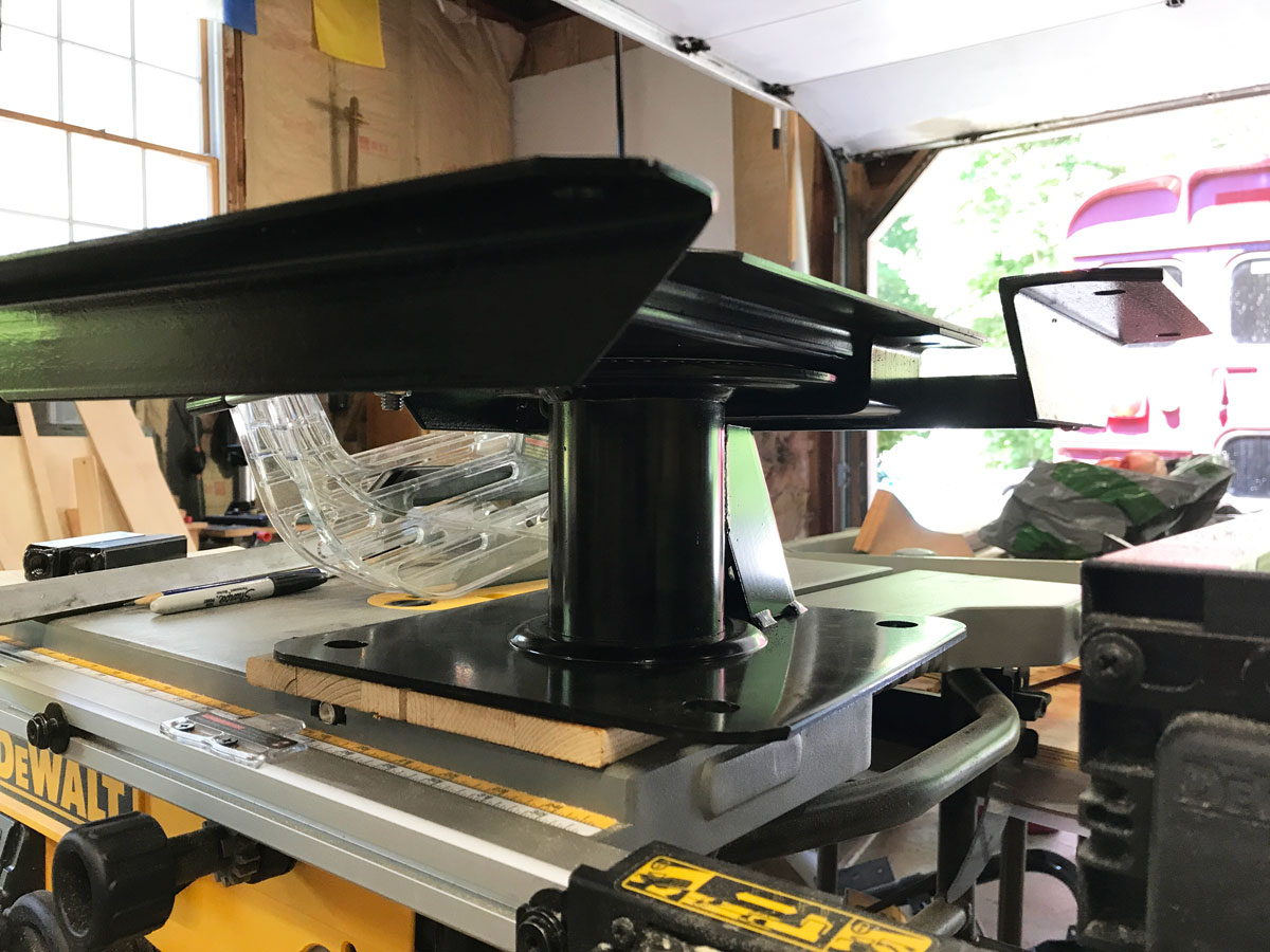In the depths of the innernets, Steph found a RecPro swivel seat mount (paid link) that they use in Class A RVs, those big honkin’ ones the size of Greyhound buses. The thing is a beaut! It came powder-coated (fancy electric paint), had a choice of pedestal heights, and had a locking swiveler. She found it on the ‘zon and it was at the house only a few days later.