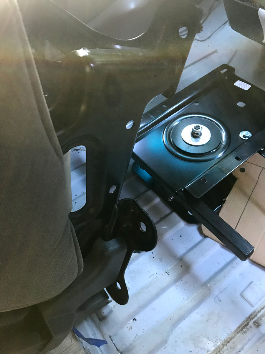 So, after some widening of holes, we popped some Grade 8 hardware into the seat and base, using NyLock-esque nuts (paid link), which have a little nylon jammed in the threads, so they don’t loosen up; sort of like a split washer, but easier. I chose those because that’s what the GMC factory did with the driver’s seat base, so I followed their lead. Once the seat was married to the base, we positioned it exactly where we wanted it, then took a peak under the bus to make sure we weren’t drilling into a brake or gas line, making sure we didn’t fill up the cab with Black Gold, or Texas Tea.