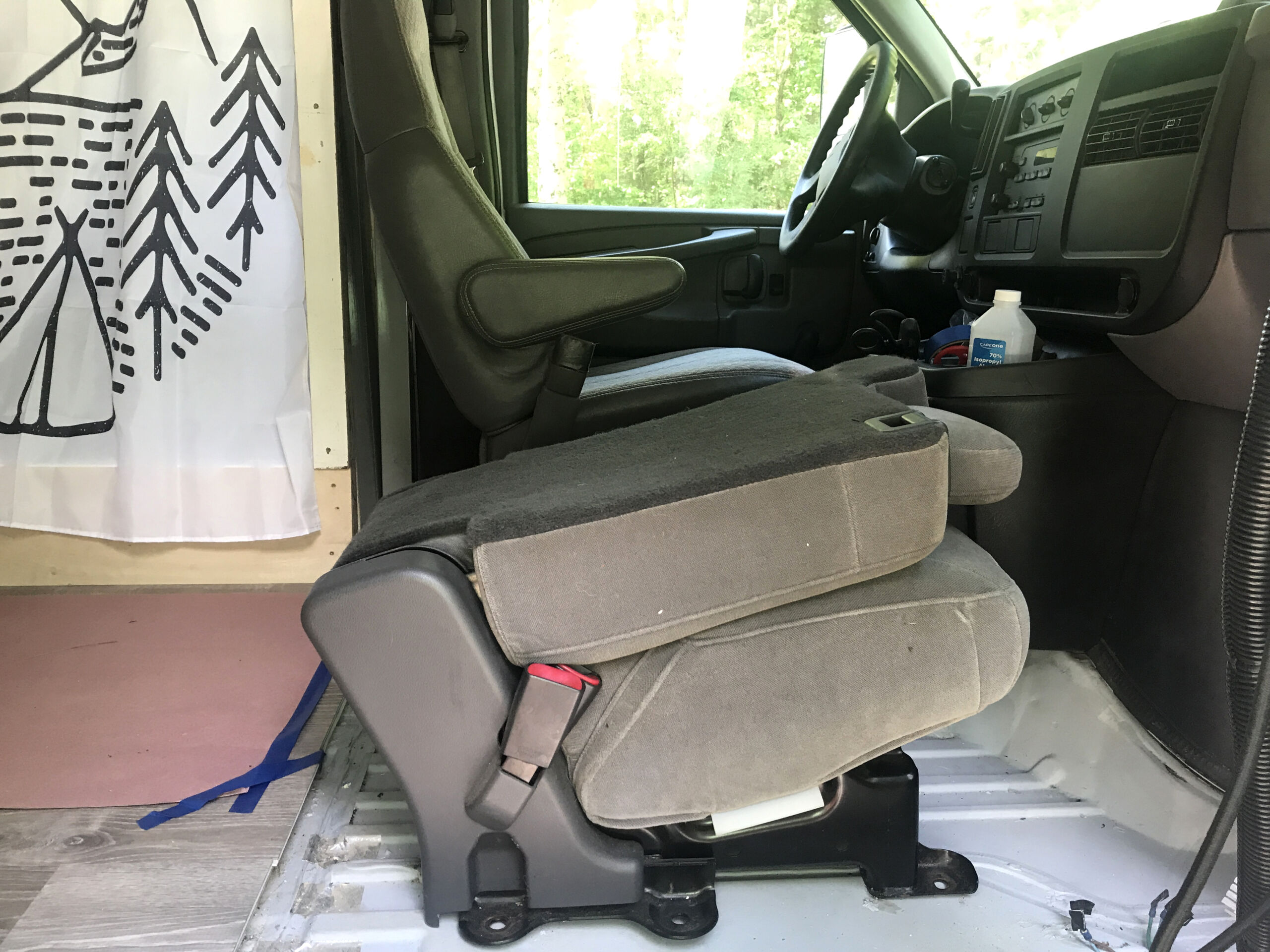 This gem, which happened to closely match the grey of our driver seat, was inexpensive, folded down, came with hardware, and featured an integrated seatbelt. This thing was also surprisingly comfy for being a spot for a 7th Brady kid (sorry Oliver). The integrated seatbelt was a big find, because if we didn’t have one and we got in an accident, the poor navigator could end up in the back seat of the car in front of us, which would make it really hard for them to pass the snacks efficiently. If we had to build our own seatbelt structure, that would have taken some time too, as we didn’t have a typical B-pillar to provide a solid anchor for the seatbelt.