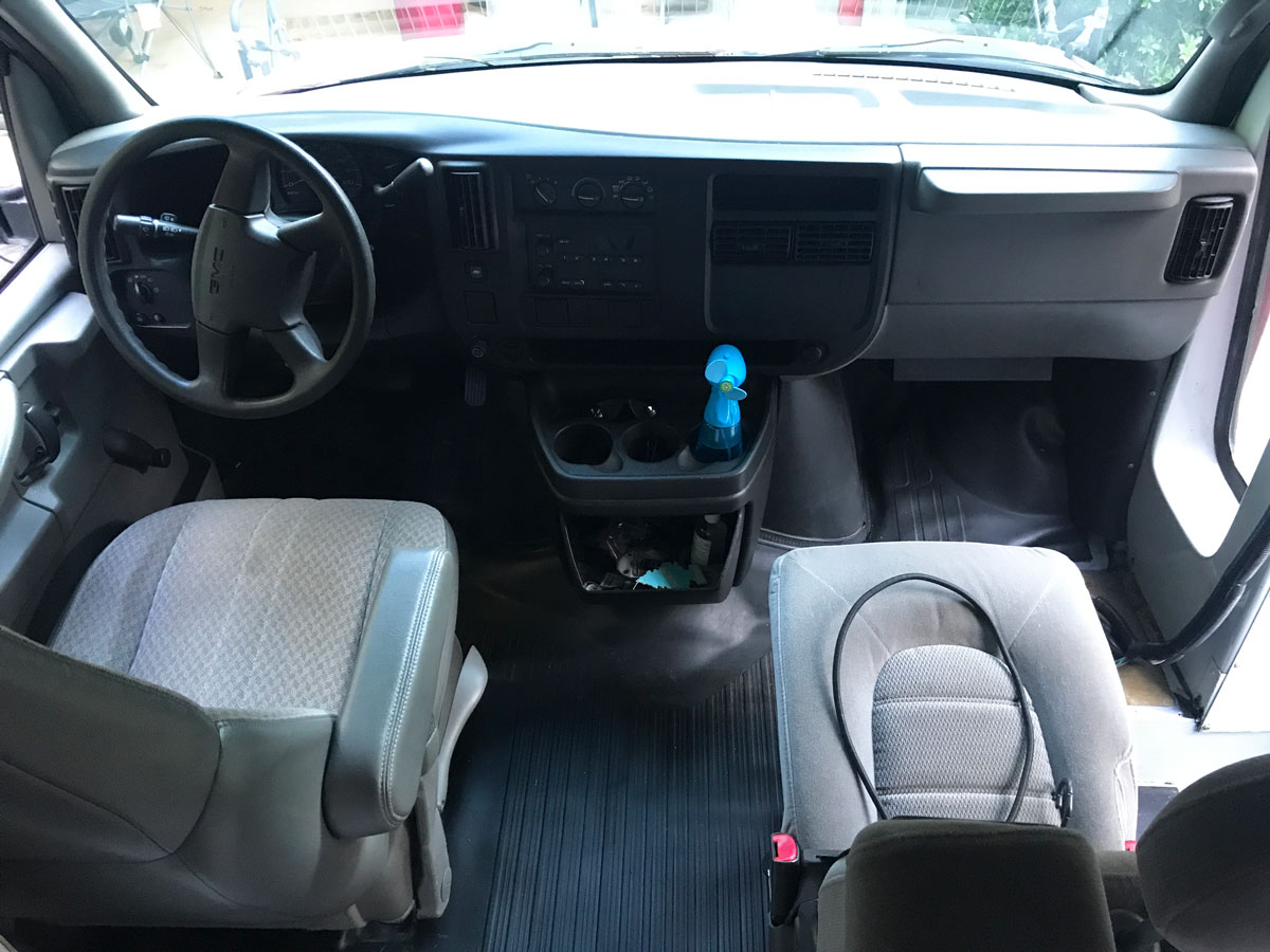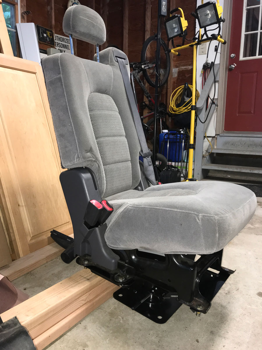 We wanted a comfy place for the co-driver to hang out and be able to chat and give directions and claw at the dashboard during near-misses on the highway. This location though, because of the aforementioned flappy door and grand staircase, is a bit tricky for this sort of installation. We had to make it far enough away from the stairs so that we could have easy ingress and, uh, outgress in case we had to leave in a hurry to pick up our Ray LaMontagne tickets, but also for, y’know, convenience sake. Planning this process seemed like it took forever. We found inspiration though, from these guys, who found a third-row SUV seat. Stealing this idea, we visited our local junkyard again and happened to find the center seat from the third row of a Ford Explorer that had little to no stale Lucky Charms embedded in the crevices.