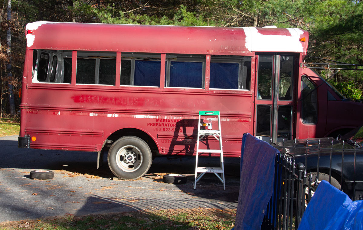 Steph goes bananas on the empty window casings. The clamps on the gutter held the tarp, which gave our bus a look from the movie Flatliners.