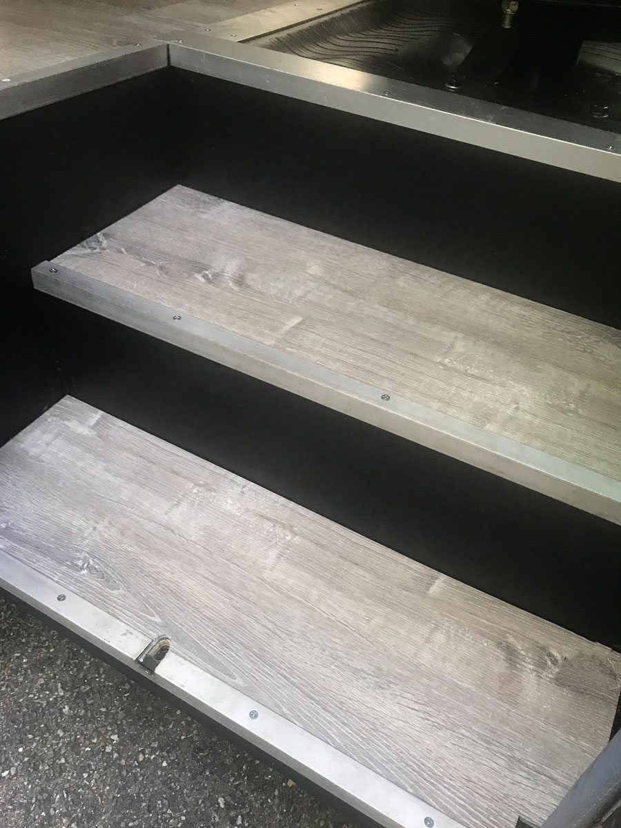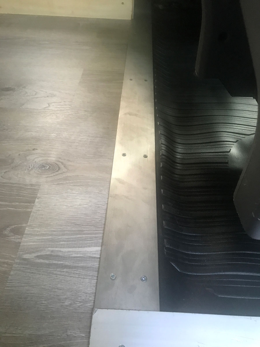 As it turns out, the stair trim was actually steel. A little heavier than aluminum, but still light enough, as we didn’t use a lot in that area. It just took a little more to drill the holes, as aluminum cuts like wood, steel cuts like, y’know, steel. Also as it turns out, the aluminum threshold transition piece was also not aluminum. And it wasn’t just steel, either. It was stainless steel, the hardest known metal in all of the dang universe. Seventy-seven drill bits, four grinder discs, and a week’s worth of truck-stop swearing later, we finally installed the threshold and a presentable foyer.