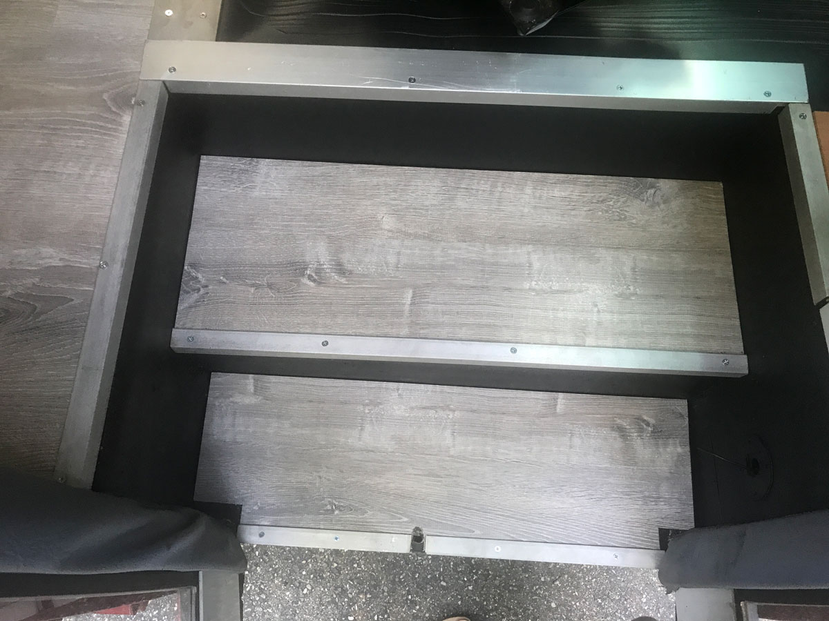 So we spruced up those stairs, installed the holy floor mat, and now it was time for some trim to tie it all together, like a good home reno show would. While at our other favorite scrap place, the Exeter joint down the road, we found some great pieces of angle iron for the step edges, and a nice, big, flat piece of aluminum to cover the transition from the foyer to the Grand Ballroom. This is also where the ‘cutaway’ part of the bus happens. You can see where the factory GM floor ends and the Corbeil bus part begins, so this was a great place for a nice threshold-y type transition.